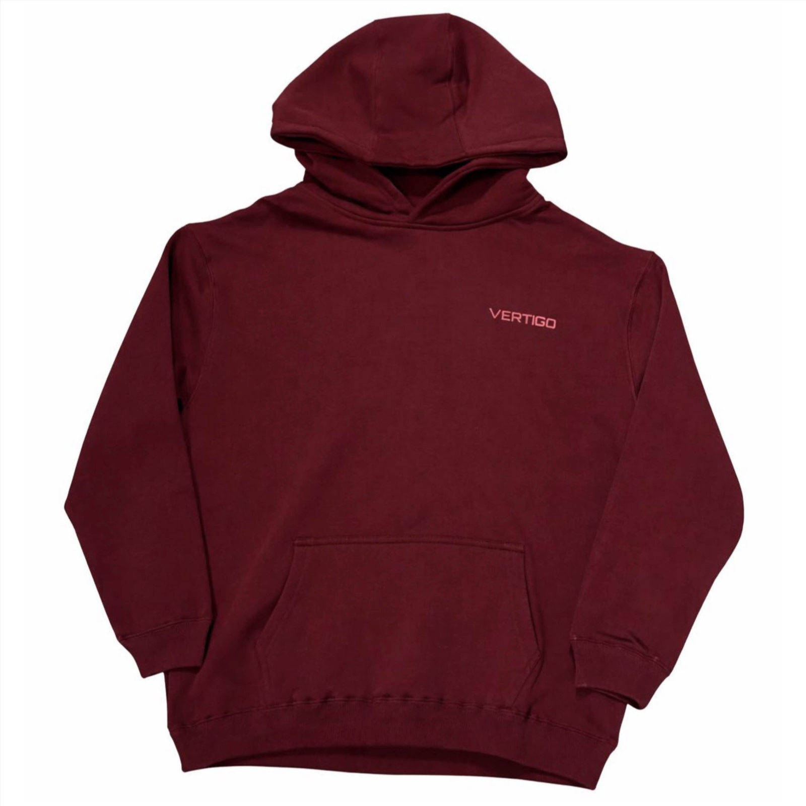 this maroon hoodie features a small puff print Vertigo logo on the right, delivering a clean, premium look with comfort and structure built in.